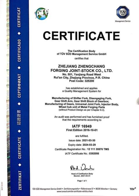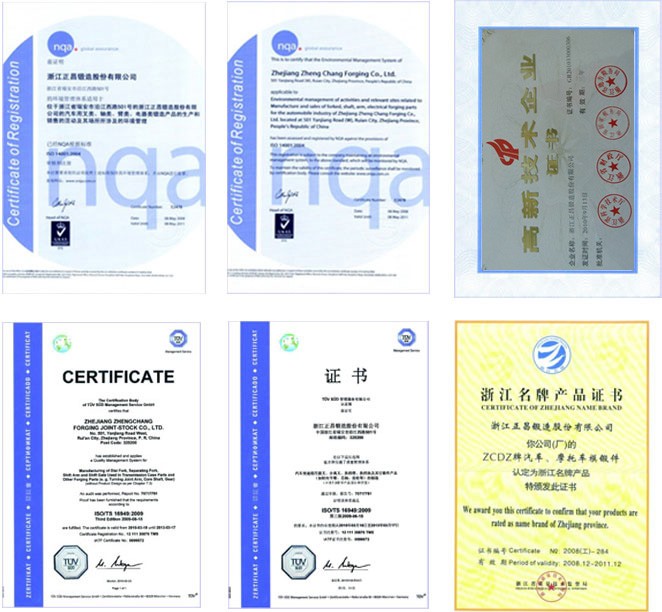 公司已获得TUV公司质量体系:IATF 16949、 ISO 9001,环境管理体系:ISO 14001,职业健康安全管理体系:ISO 45001,测量管理体系:ISO 10012《测量管理体系-测量过程和测量设备的要求》标准的要求,被评定为省级技术研发中心,浙江省高新技术企业,并拥有自营进出口权。